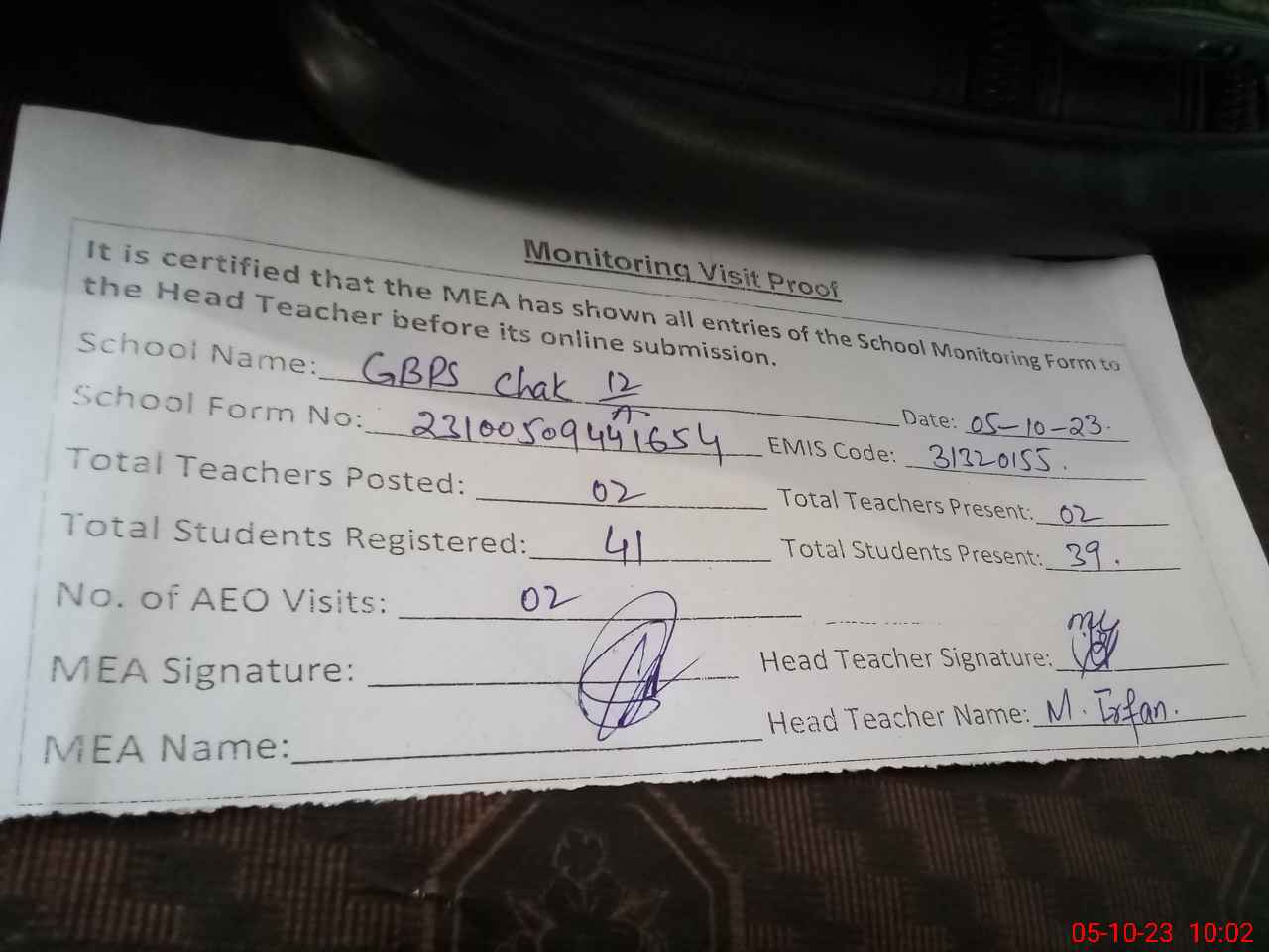 | EMIS Code: 31320155 | Name of School: GPS CHAK 12/A | |||