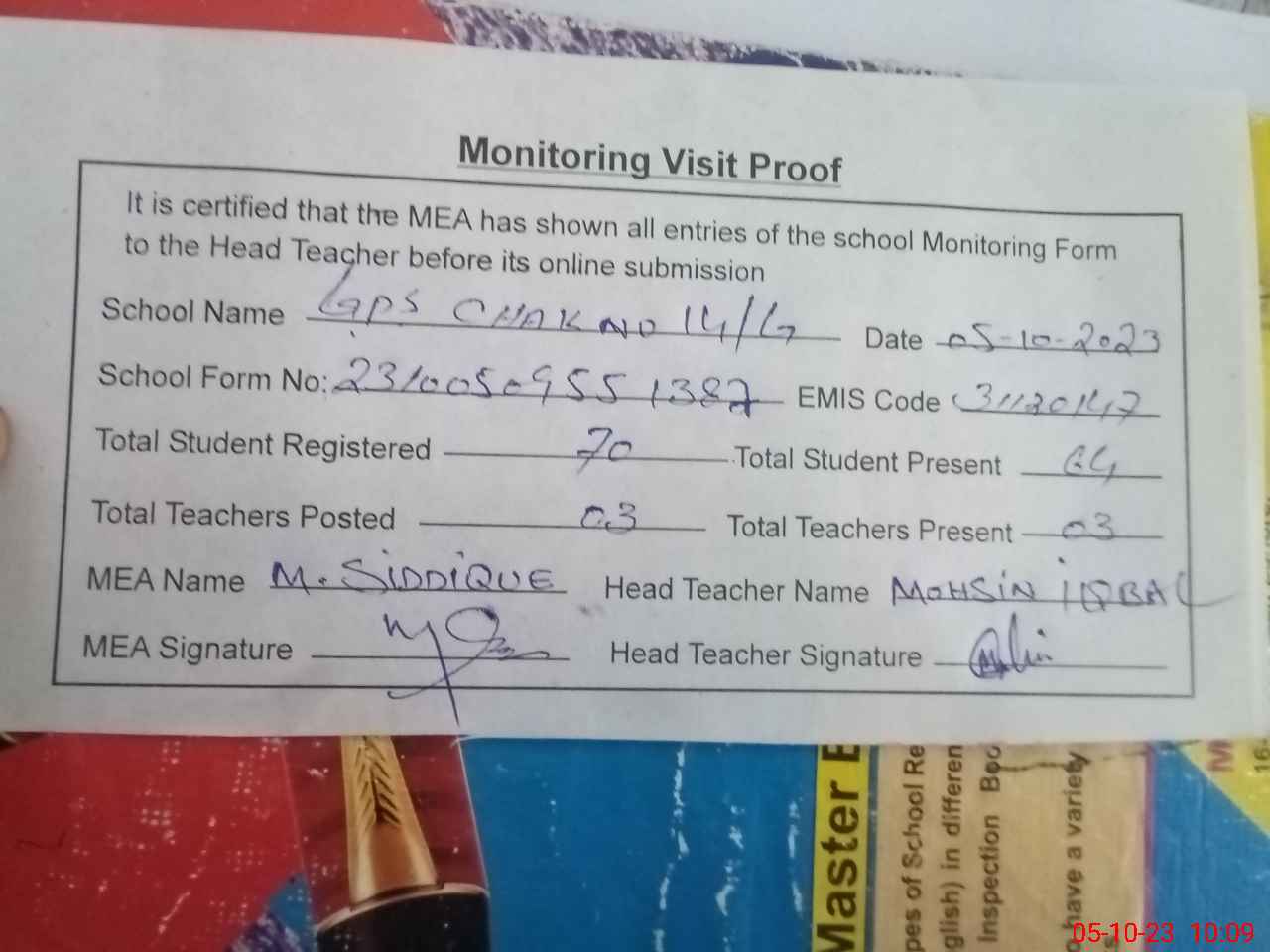 | Attendance Register | Head Teacher | MEA with School | Visit Proof |