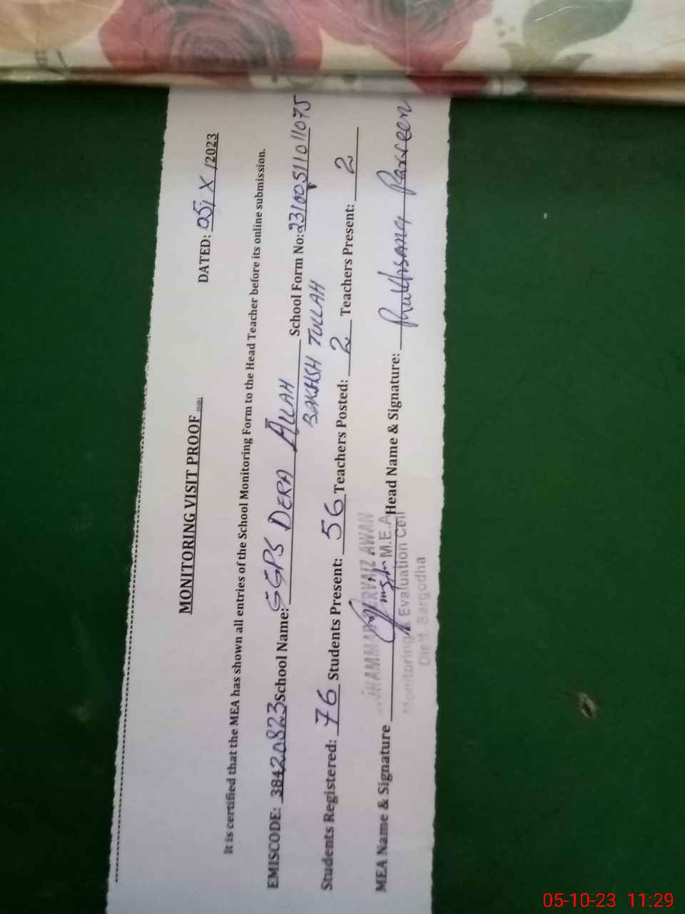 | Certified that this School was Inspected by the Undersigned MEA/DMO Today and the Information Stated Above is as Per Record. | |||||
