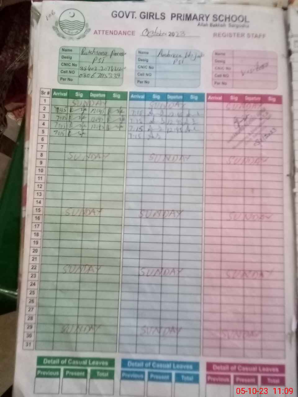 | CNIC | Full Name | Designation | R/C | Absence During Last Calender Month |