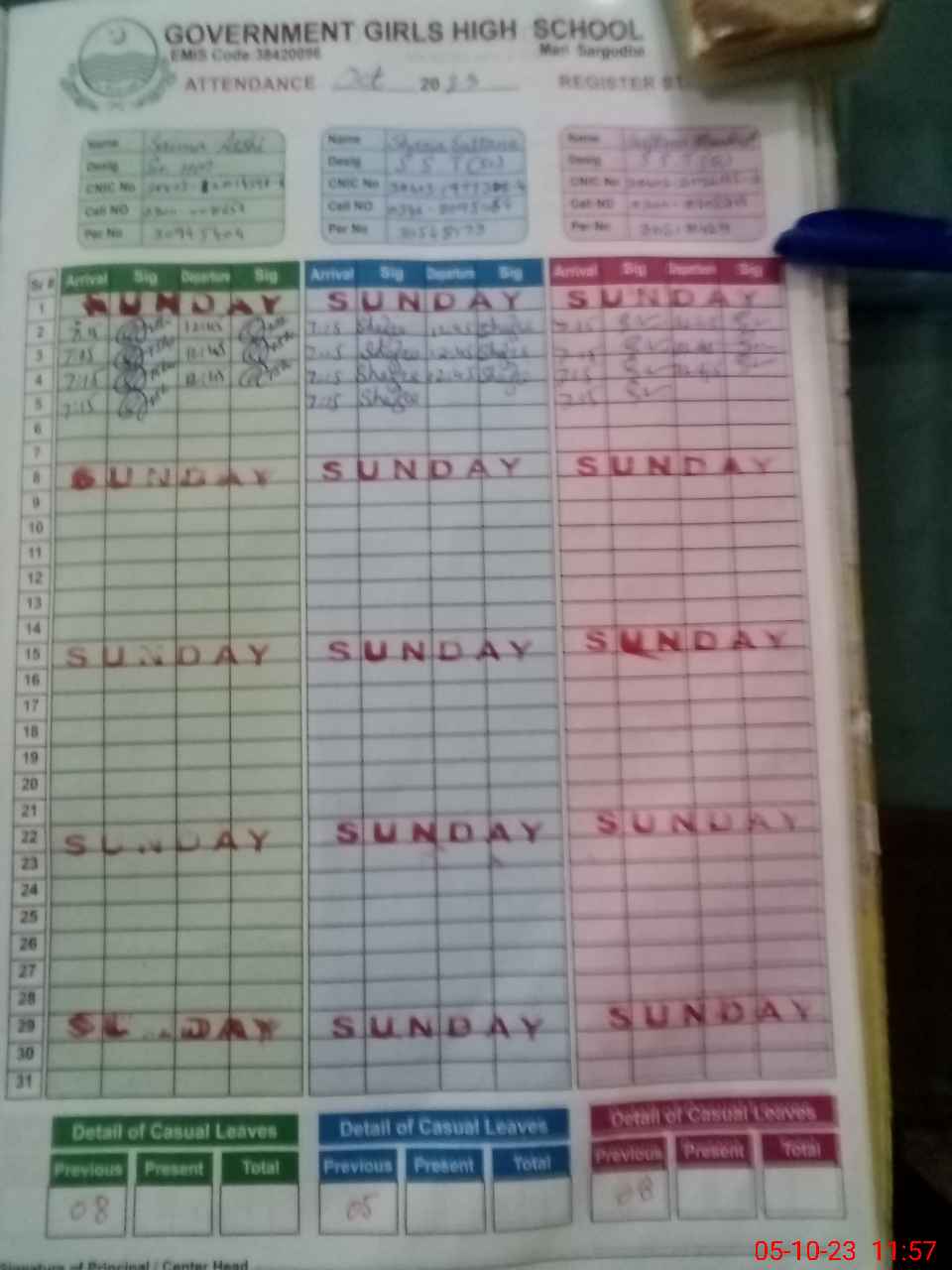 | CNIC | Full Name | Designation | R/C | Absence during last cal. month |
