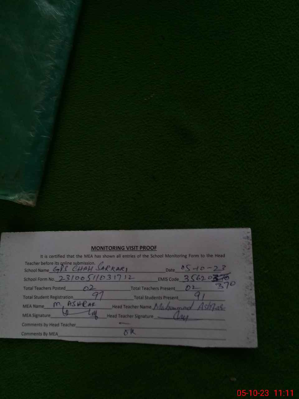 | Attendance Register | Head Teacher | MEA with School | Visit Proof |