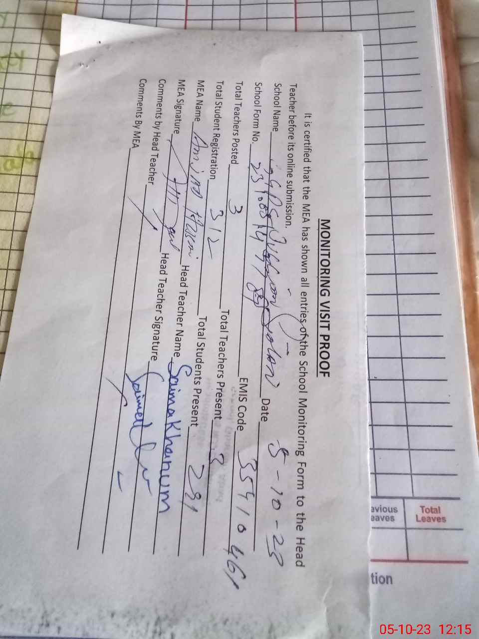 | Attendance Register | Head Teacher | MEA with School | Visit Proof |