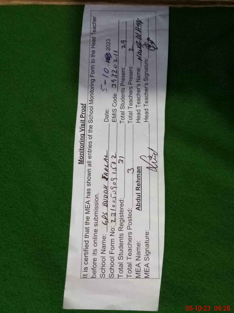 | Attendance Register | Head Teacher | MEA with School | Visit Proof |