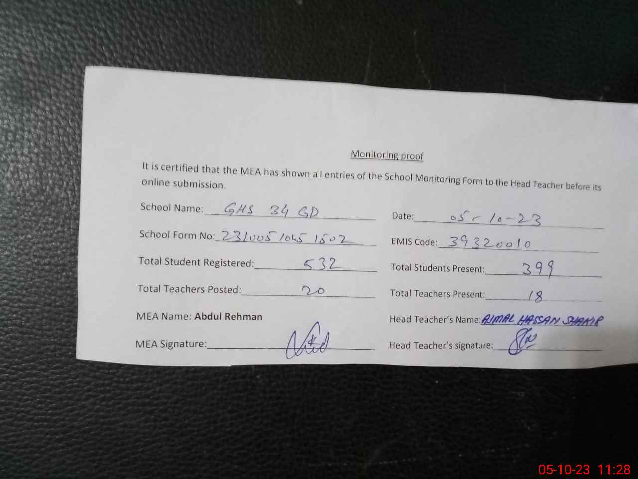 | Attendance Register | Head Teacher | MEA with School | Visit Proof |