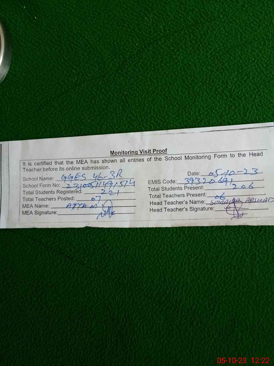 | Certified that this School was Inspected by the Undersigned MEA/DMO Today and the Information Stated Above is as Per Record. | |||||