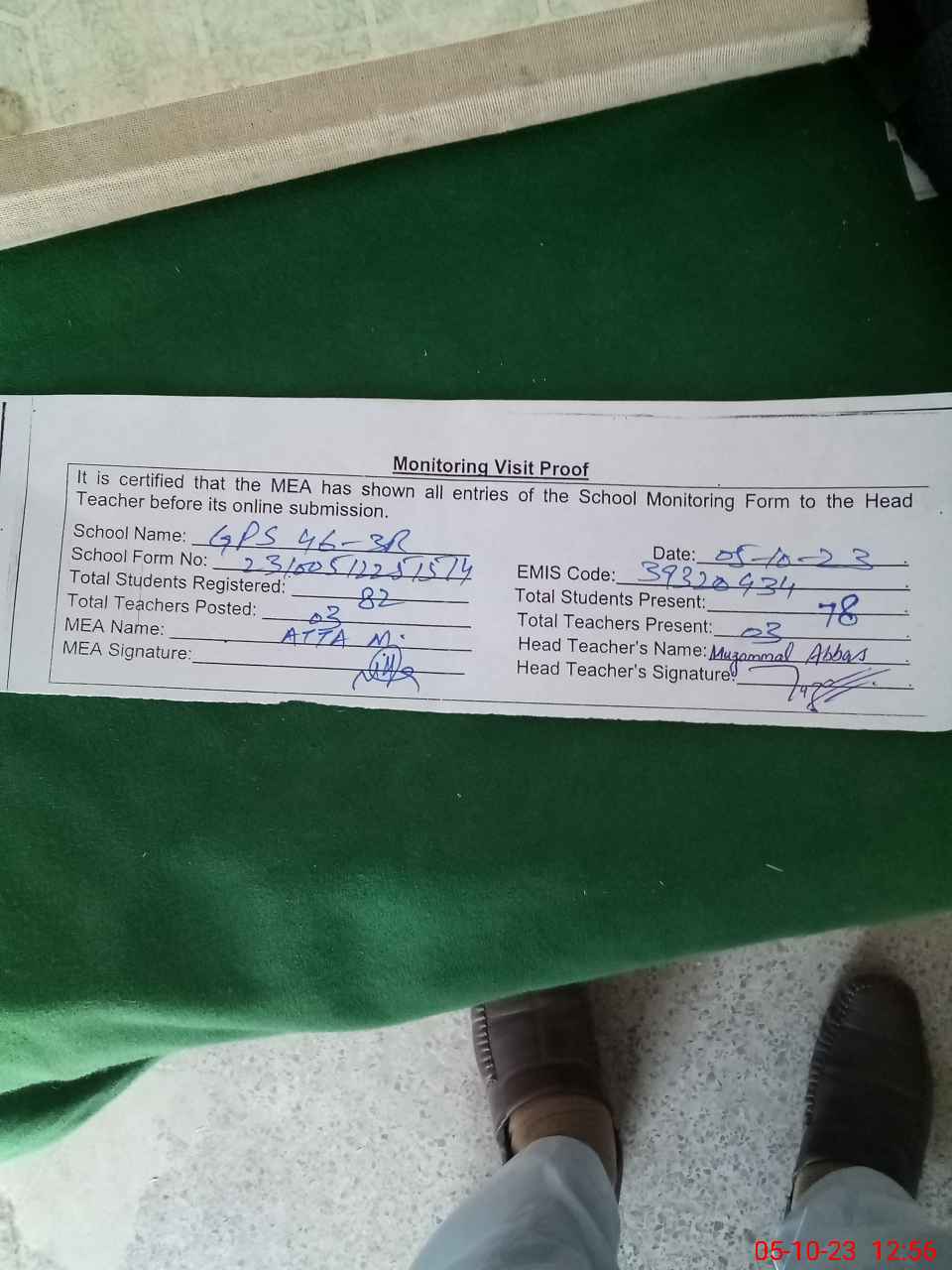 | Attendance Register | Head Teacher | MEA with School | Visit Proof |