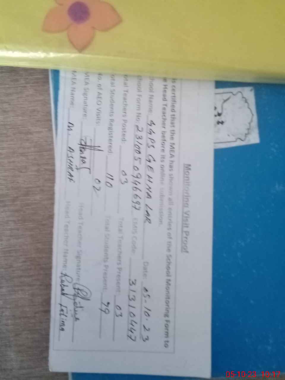 | Attendance Register | Head Teacher | MEA with School | Visit Proof |