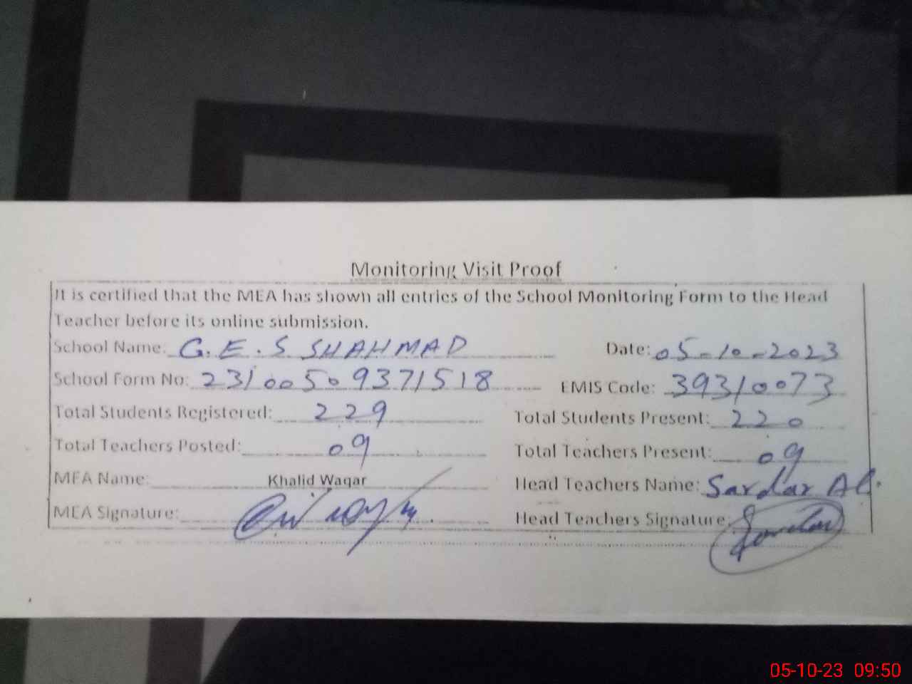 | Attendance Register | Head Teacher | MEA with School | Visit Proof |