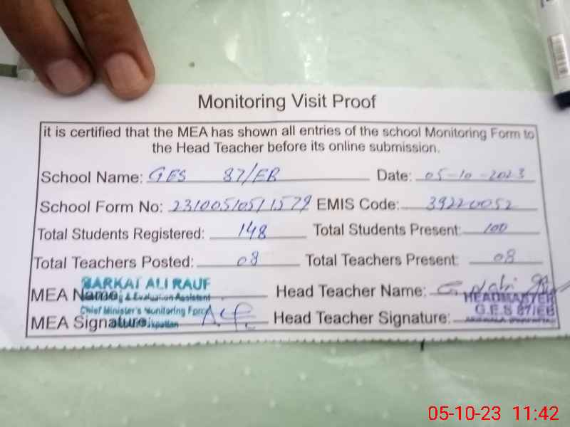 | Attendance Register | Head Teacher | MEA with School | Visit Proof |