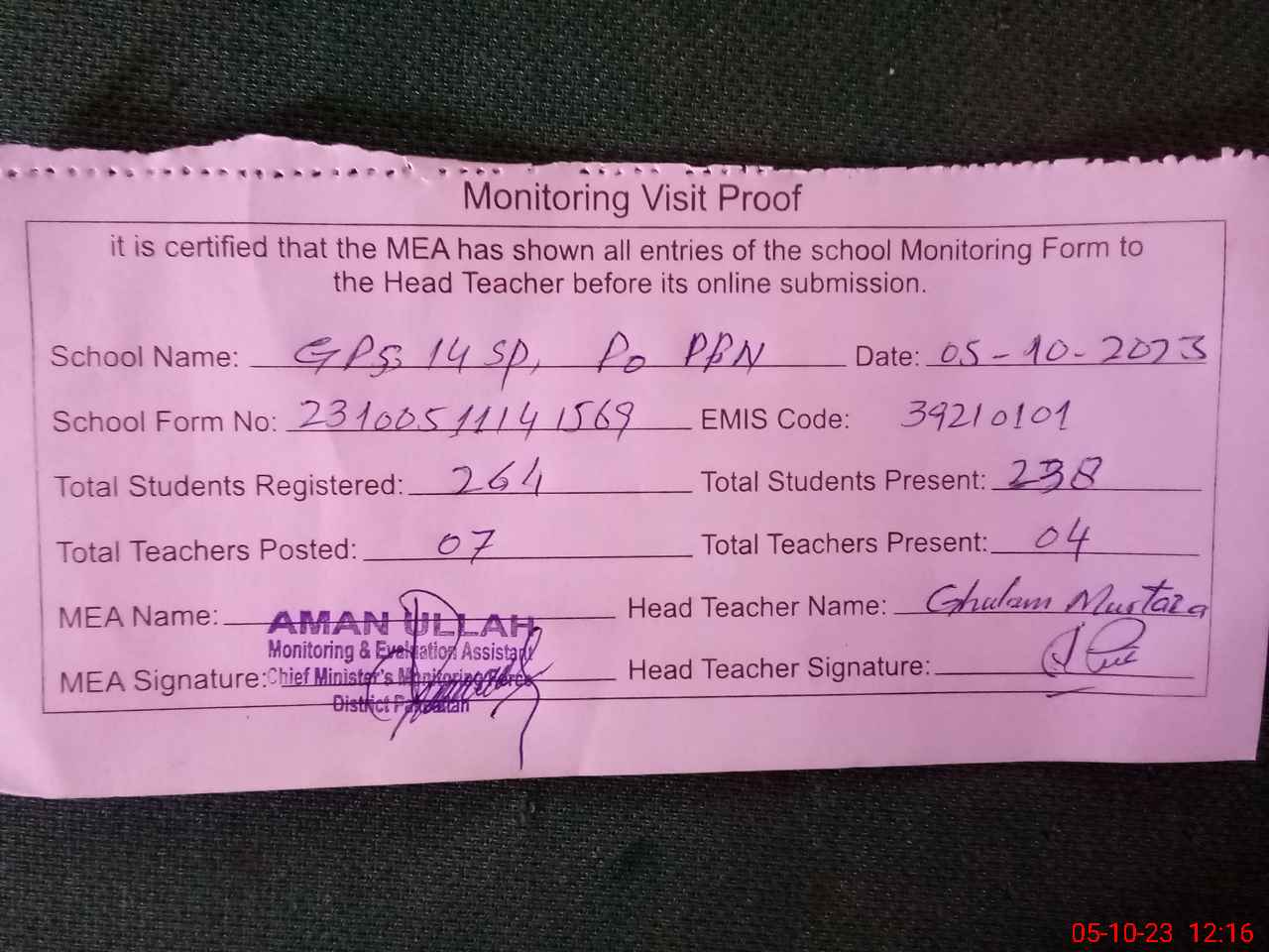 | EMIS Code: 39210101 | Name of School: GPS 14-SP P.O PAKPATTAN | |||