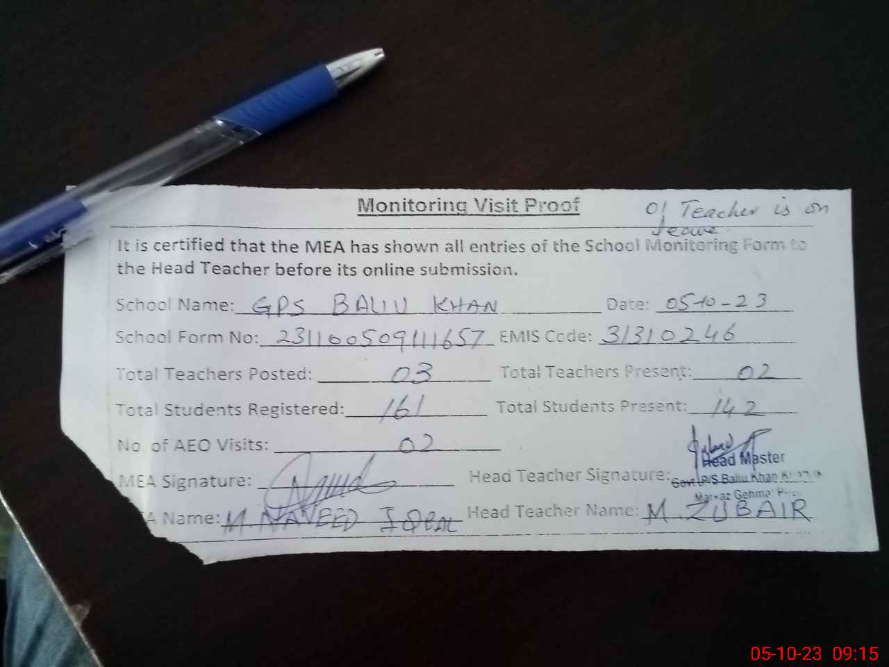 | Attendance Register | Head Teacher | MEA with School | Visit Proof |