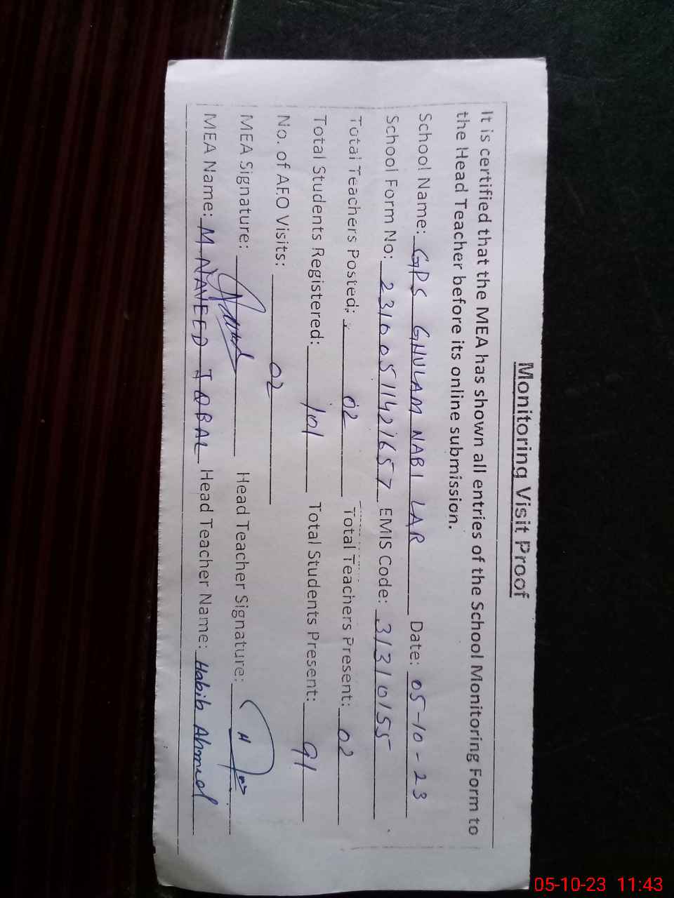 | EMIS Code: 31310155 | Name of School: GPS GHULAM NABI LAR | |||