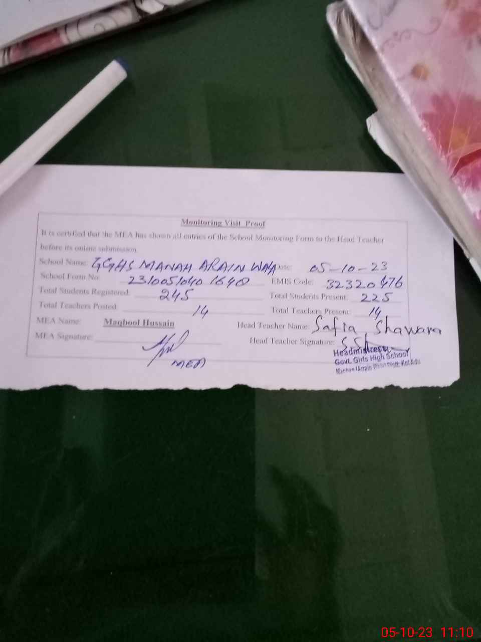 | Attendance Register | Head Teacher | MEA with School | Visit Proof |