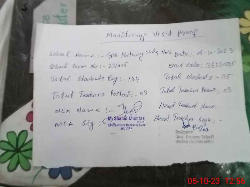 | EMIS Code: 36130295 | Name of School: GPS KOTHEY WALA NO. 2 MULTAN | |||