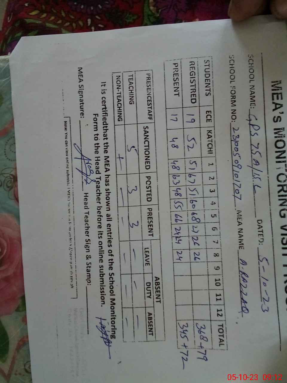 | Attendance Register | Head Teacher | MEA with School | Visit Proof |