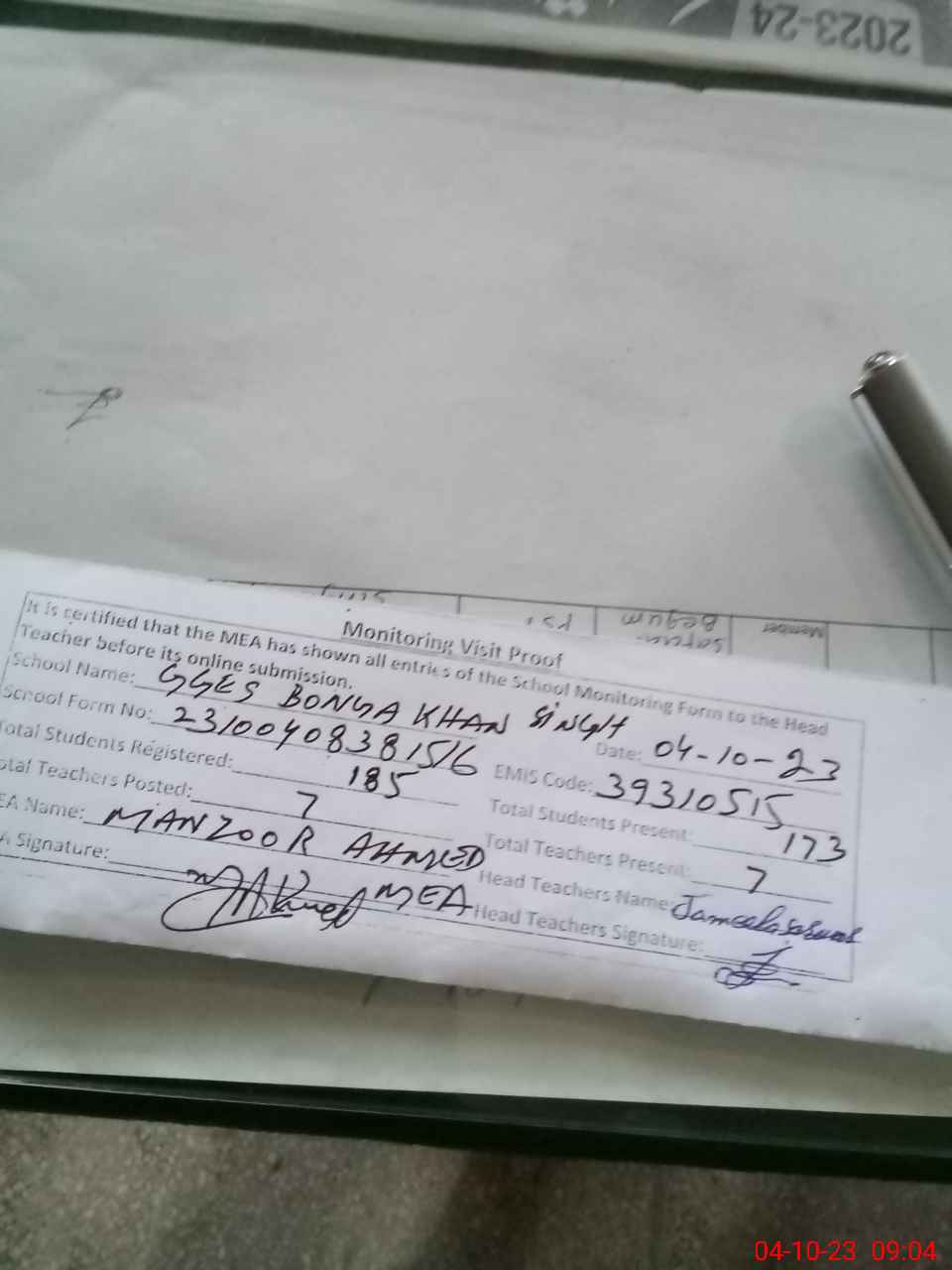 | Attendance Register | Head Teacher | MEA with School | Visit Proof |