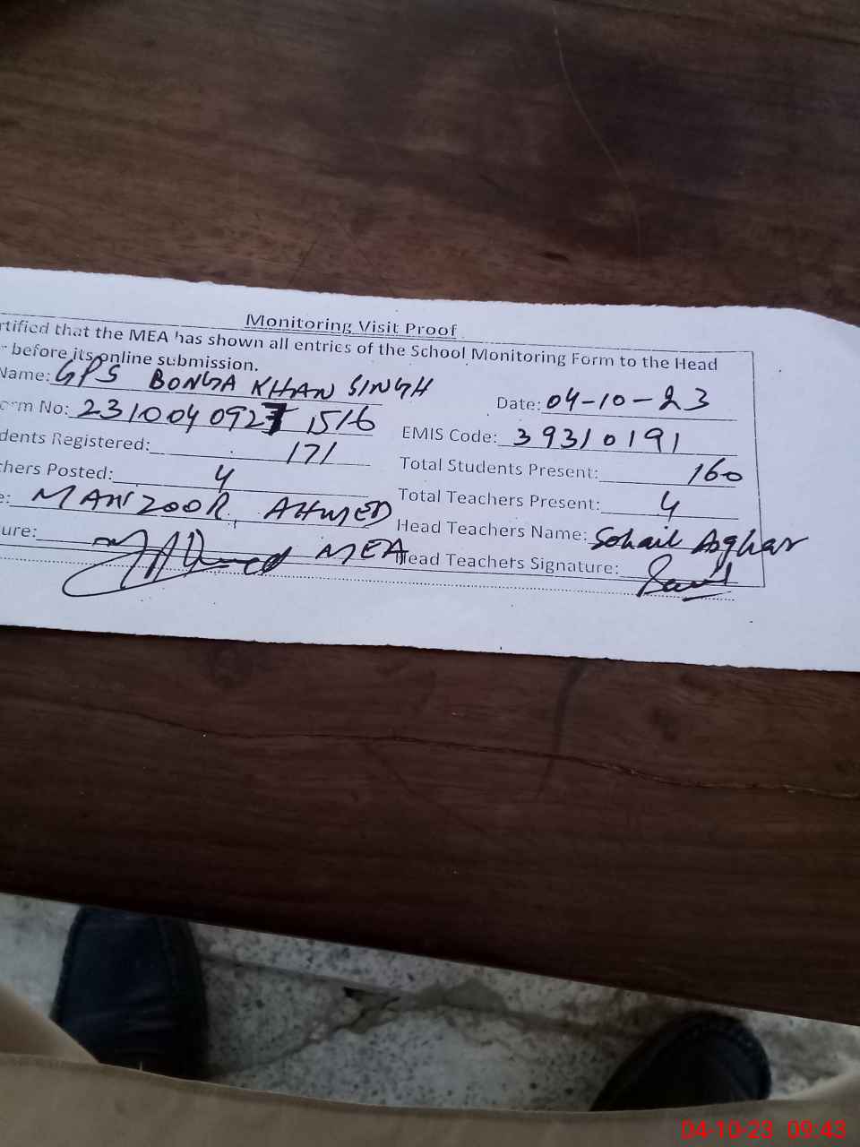 | Attendance Register | Head Teacher | MEA with School | Visit Proof |