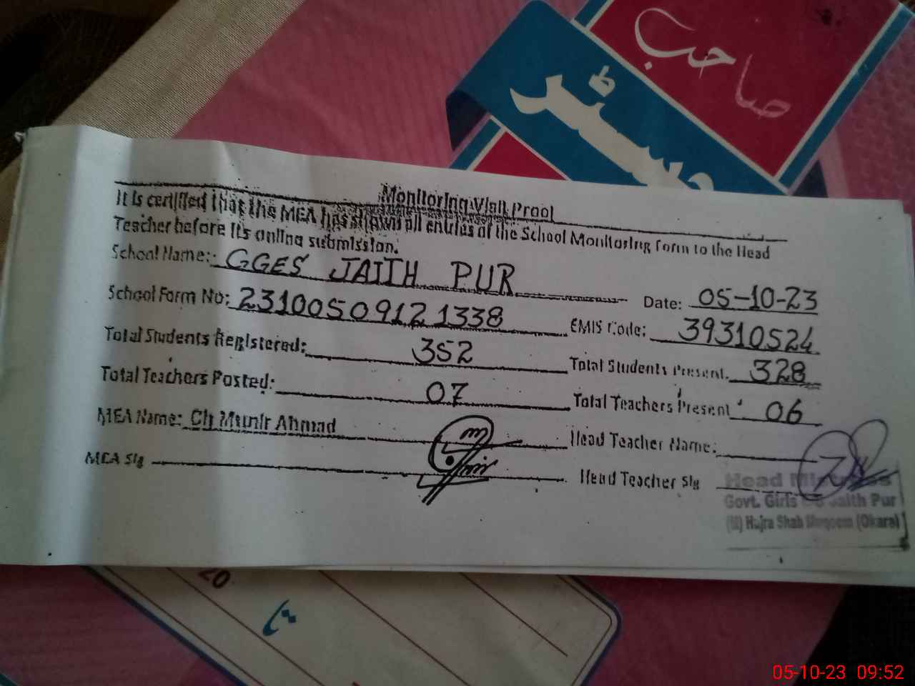 | Certified that this School was Inspected by the Undersigned MEA/DMO Today and the Information Stated Above is as Per Record. | |||||