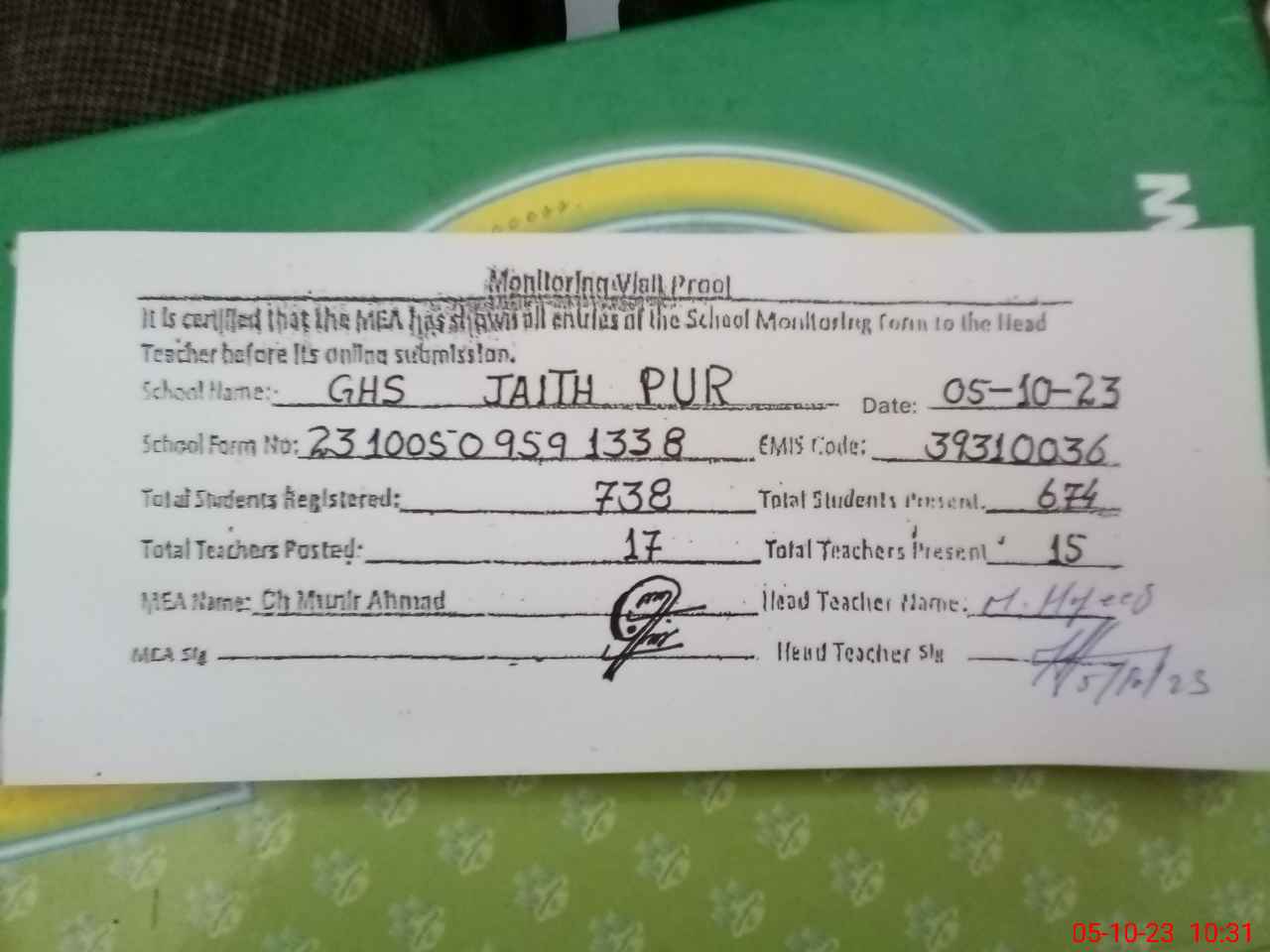 | Monitoring Date: 05-10-2023 | Start Time: 05-10-2023 09:59 AM | End Time: 05-10-2023 10:33 AM | Name of MEA: MU**** AH**** | |