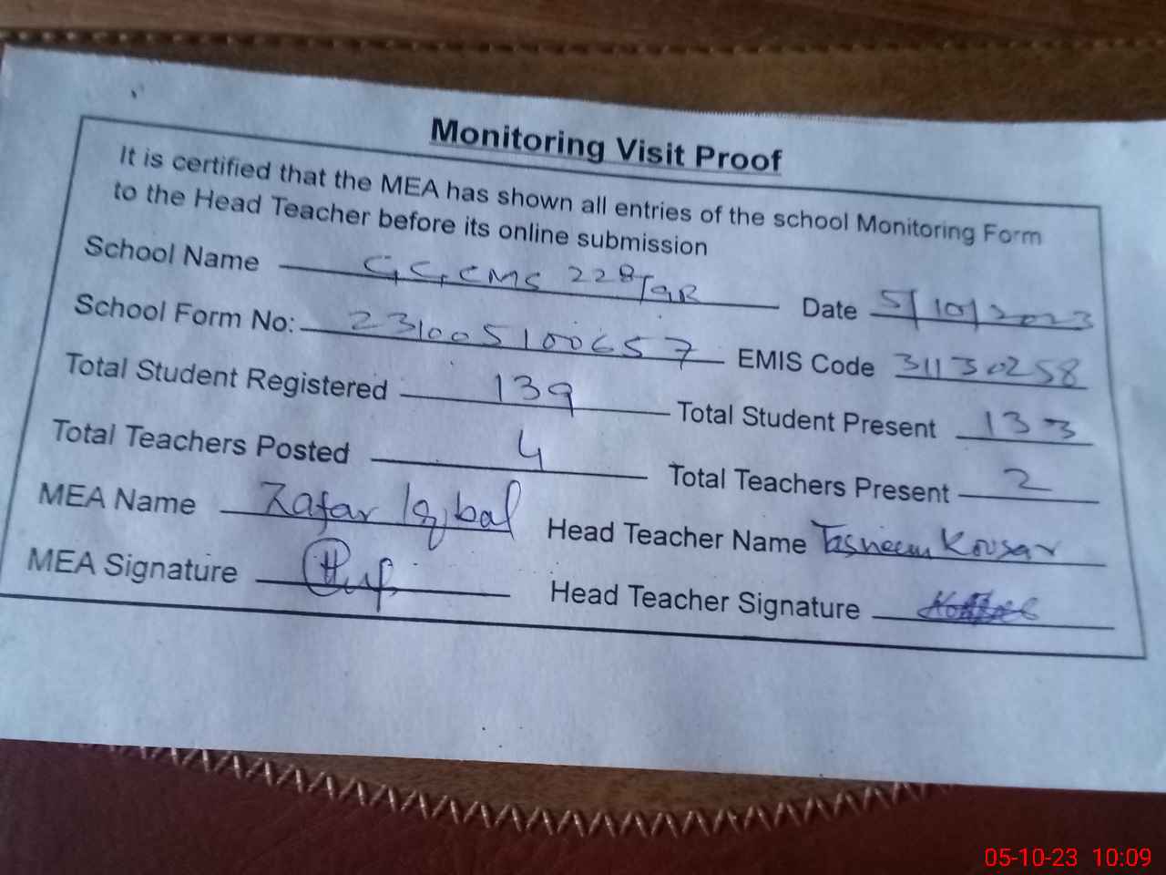 | Monitoring Date: 05-10-2023 | Start Time: 05-10-2023 09:55 AM | End Time: 05-10-2023 10:09 AM | Name of MEA: Za**** Iq**** BN**** | |
