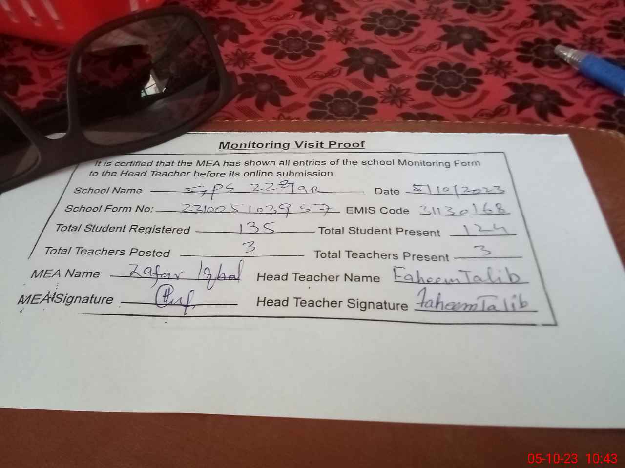 | Monitoring Date: 05-10-2023 | Start Time: 05-10-2023 10:16 AM | End Time: 05-10-2023 10:44 AM | Name of MEA: Za**** Iq**** BN**** | |