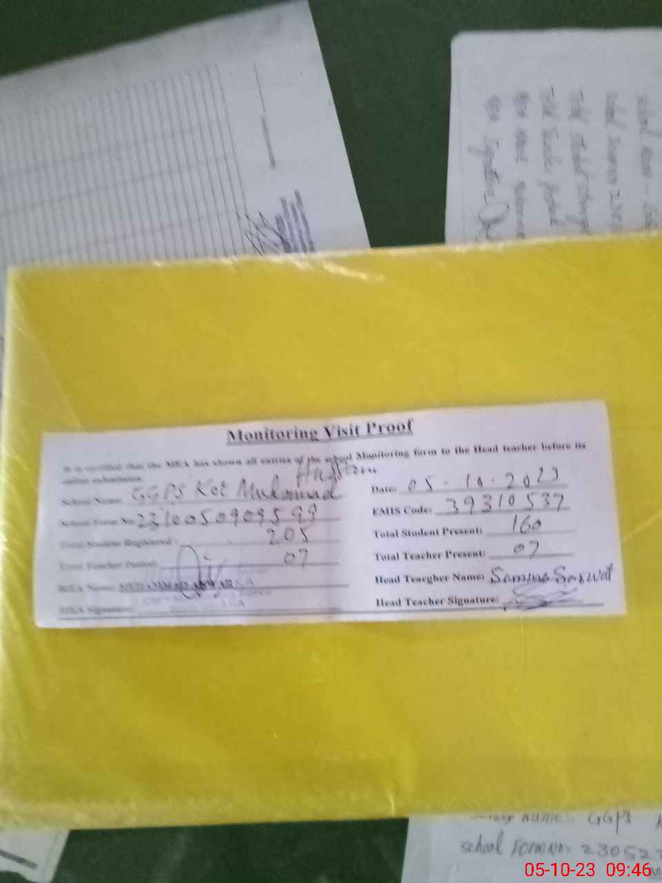 | Attendance Register | Head Teacher | MEA with School | Visit Proof |