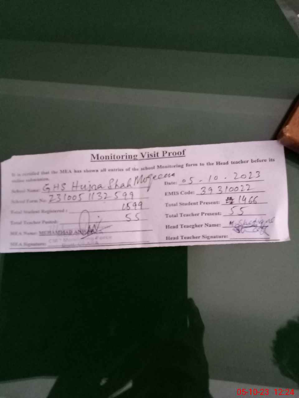 | Attendance Register | Head Teacher | MEA with School | Visit Proof |
