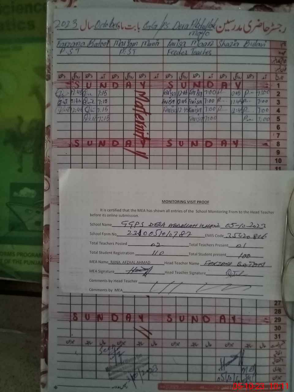 | Attendance Register | Head Teacher | MEA with School | Visit Proof |