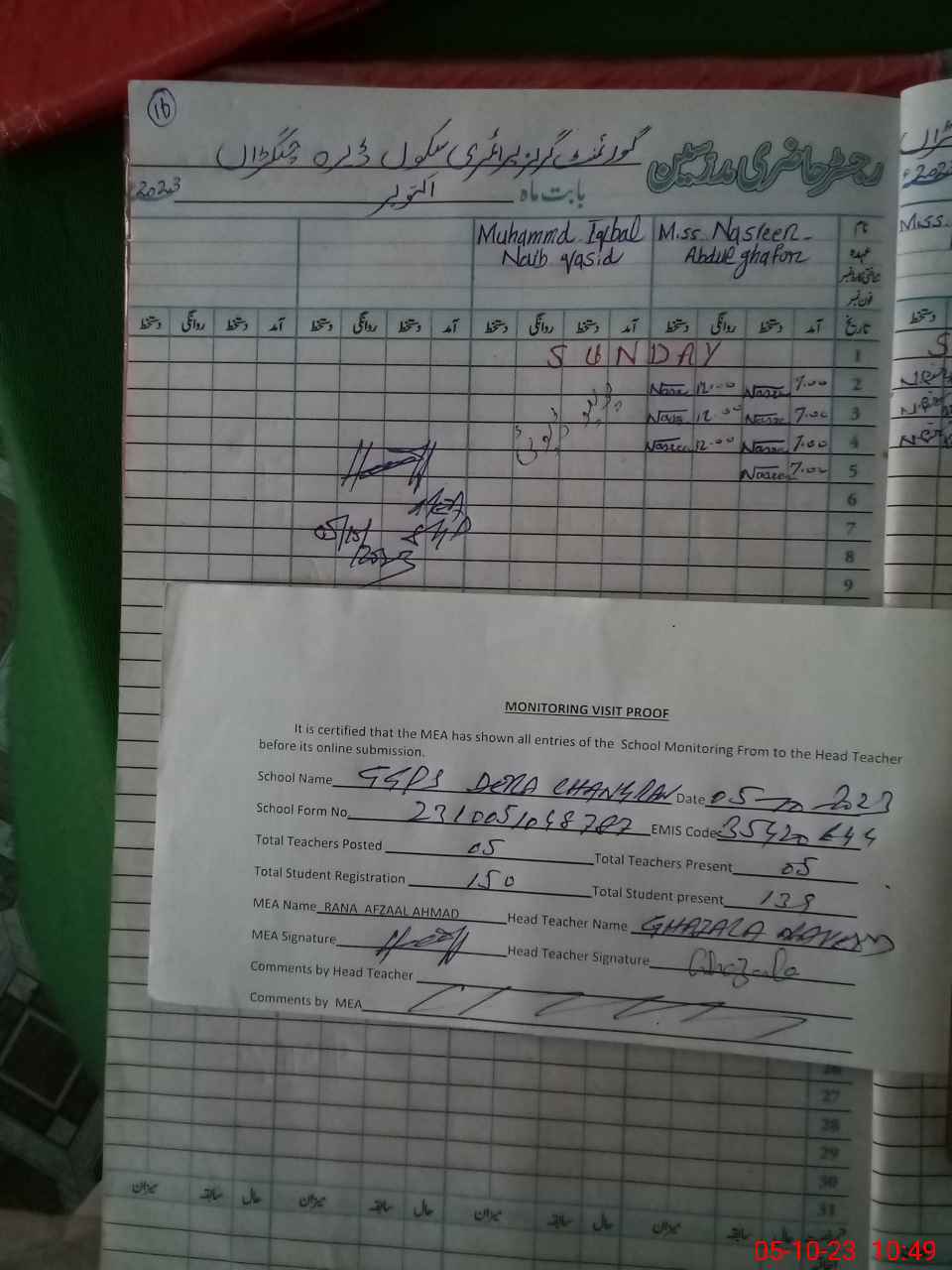 | Attendance Register | Head Teacher | MEA with School | Visit Proof |