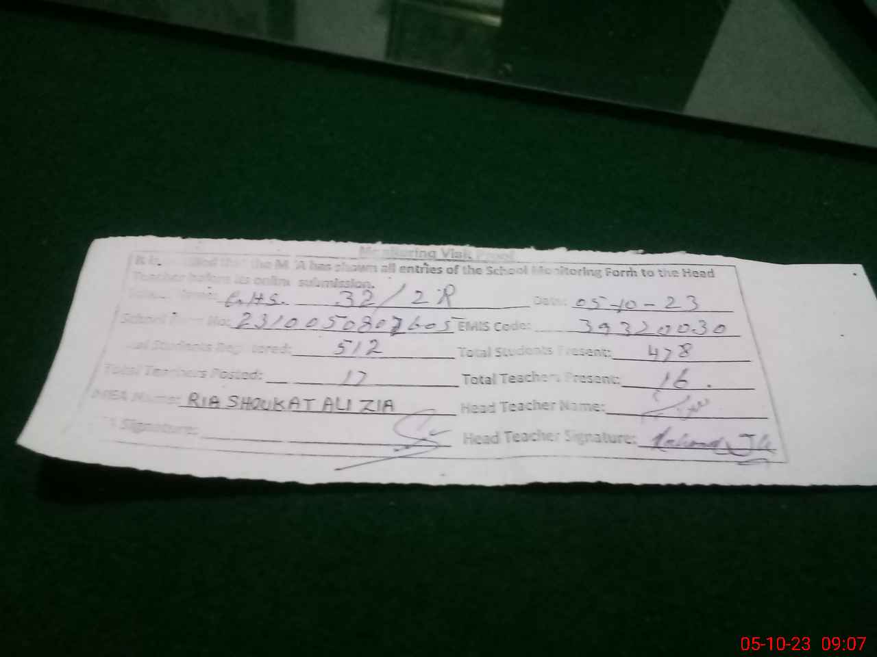 | Monitoring Date: 05-10-2023 | Start Time: 05-10-2023 08:02 AM | End Time: 05-10-2023 09:07 AM | Name of MEA: SH**** AL**** ZI**** (R**** | |