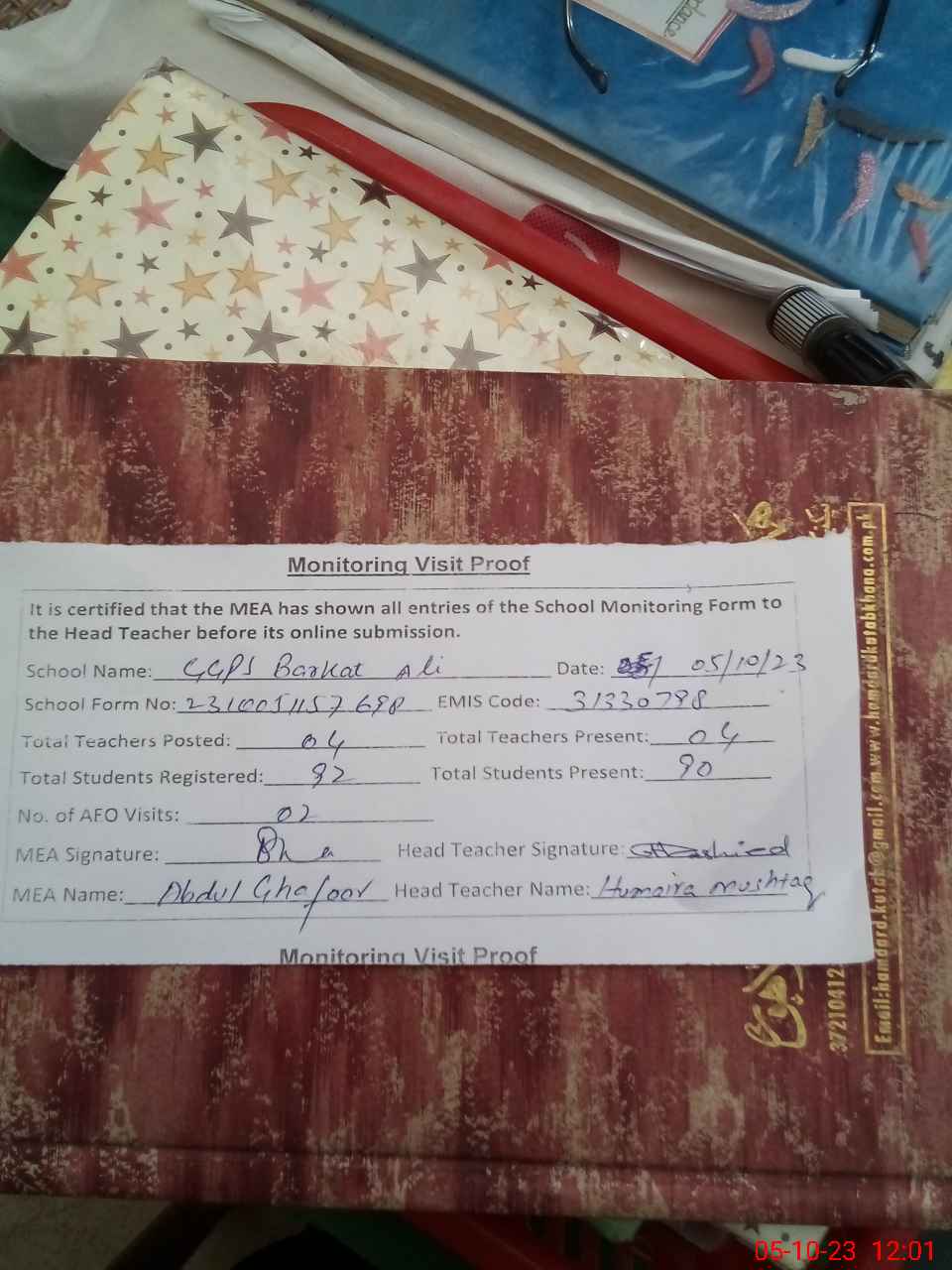 | Attendance Register | Head Teacher | MEA with School | Visit Proof |