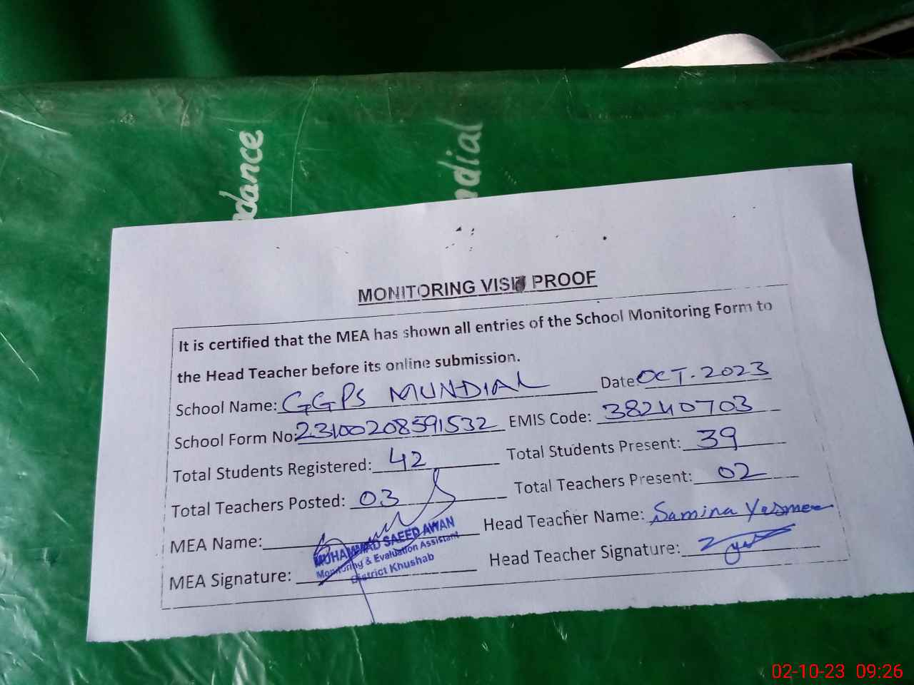 | Monitoring Date: 02-10-2023 | Start Time: 02-10-2023 08:58 AM | End Time: 02-10-2023 09:26 AM | Name of MEA: MU**** SA**** | |