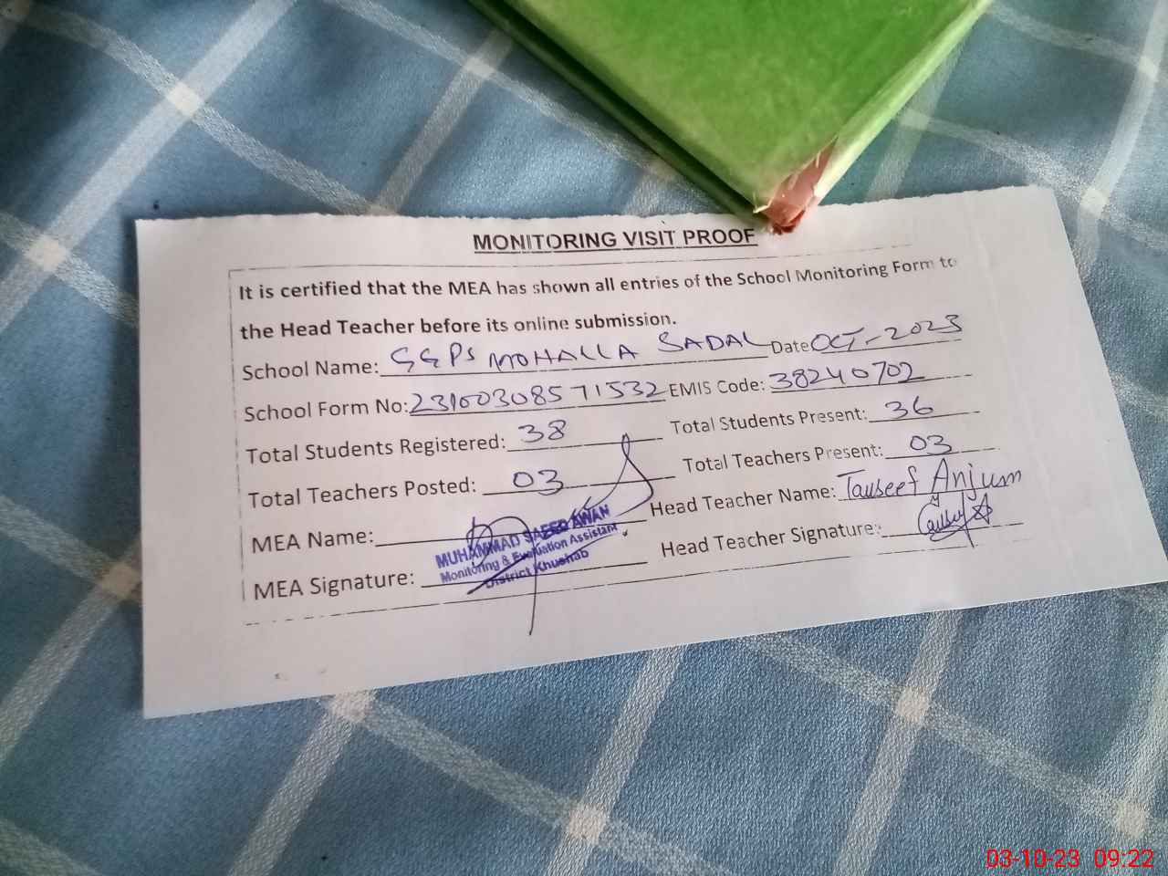 | EMIS Code: 38240702 | Name of School: GGPS MOHALLA SADDAL | |||