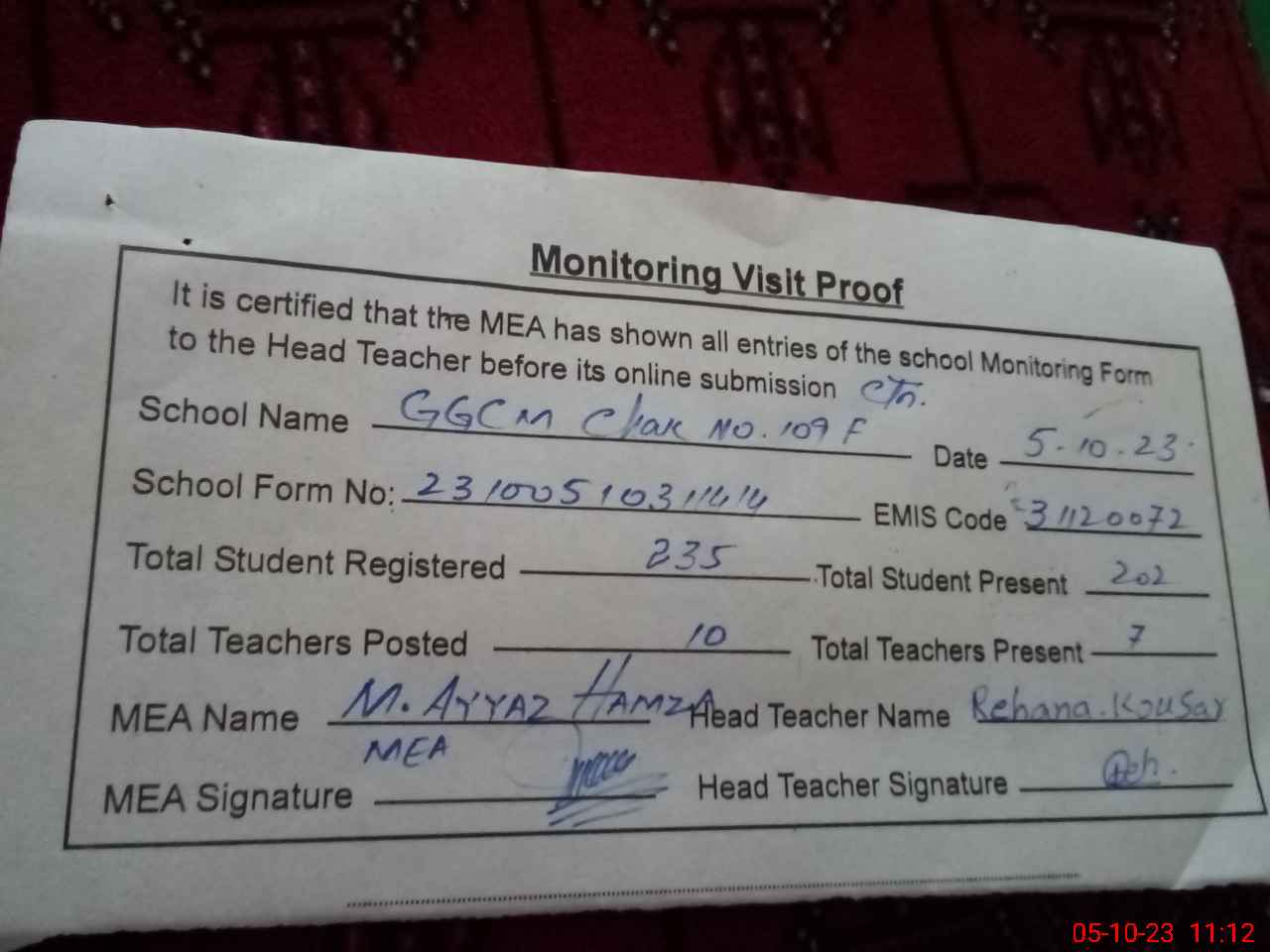 | EMIS Code: 31120072 | Name of School: GGCMES CHAK NO. 109/F | |||