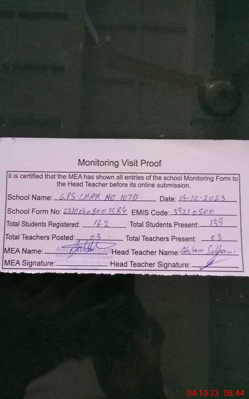 | EMIS Code: 39210500 | Name of School: GPS CHAK NO. 107 /D | |||
