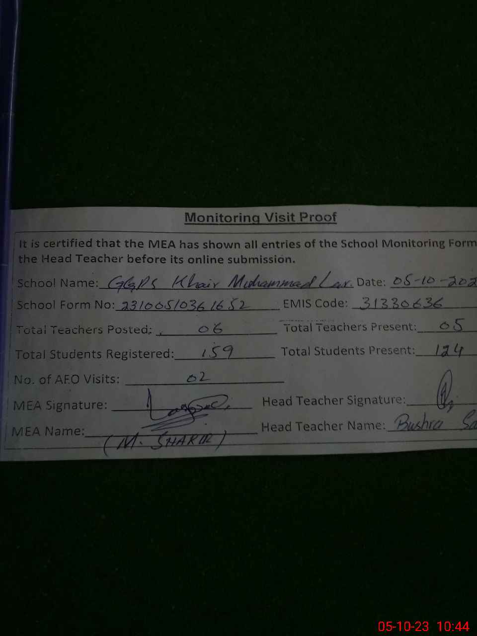 | Monitoring Date: 05-10-2023 | Start Time: 05-10-2023 09:52 AM | End Time: 05-10-2023 10:46 AM | Name of MEA: Mu**** Sh**** | |