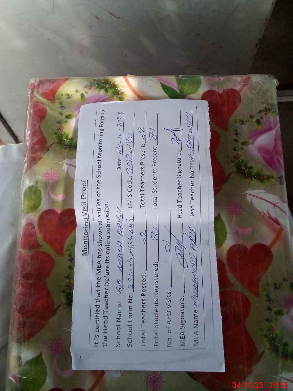 | Attendance Register | Head Teacher | MEA with School | Visit Proof |