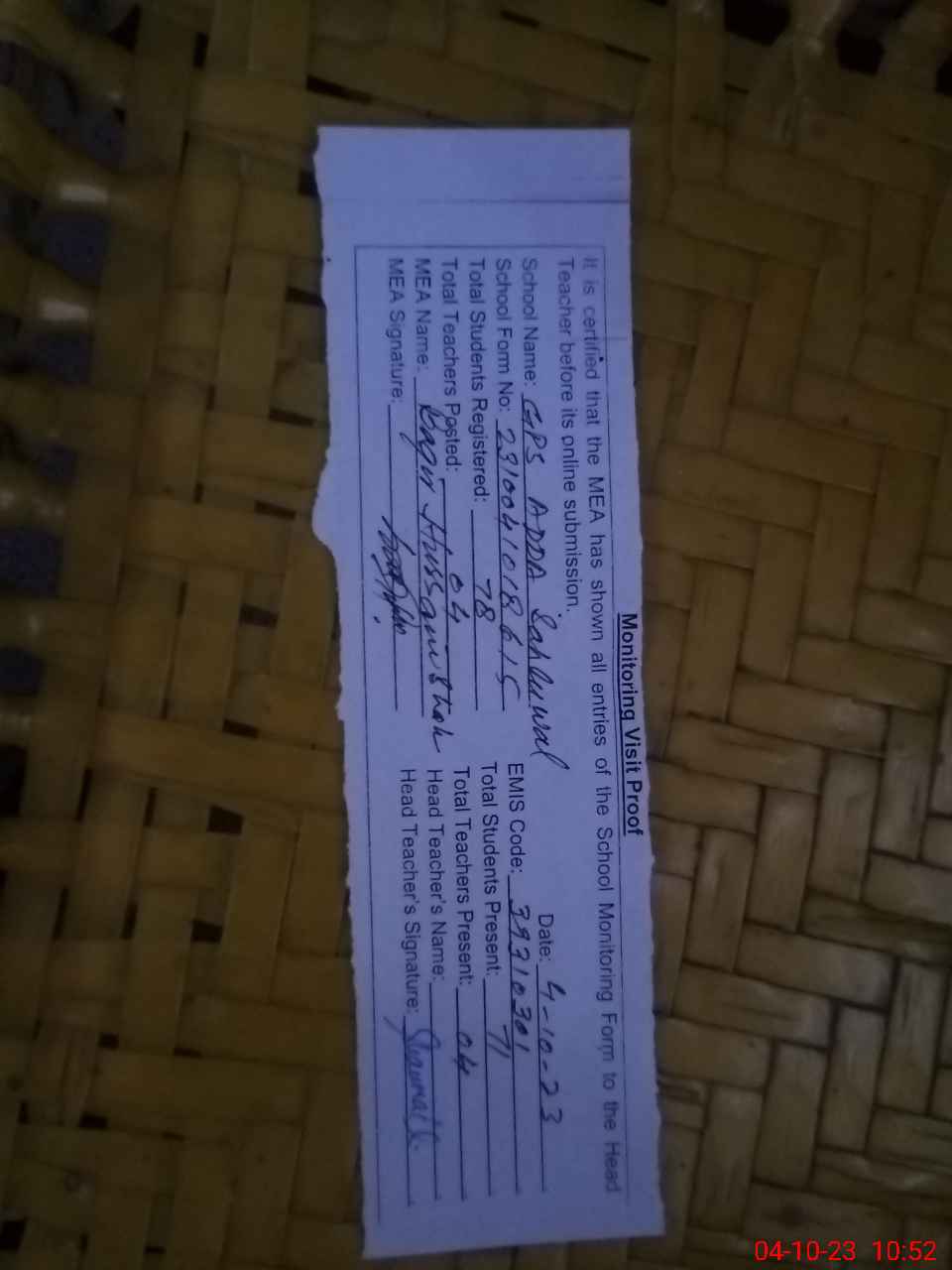 | Attendance Register | Head Teacher | MEA with School | Visit Proof |