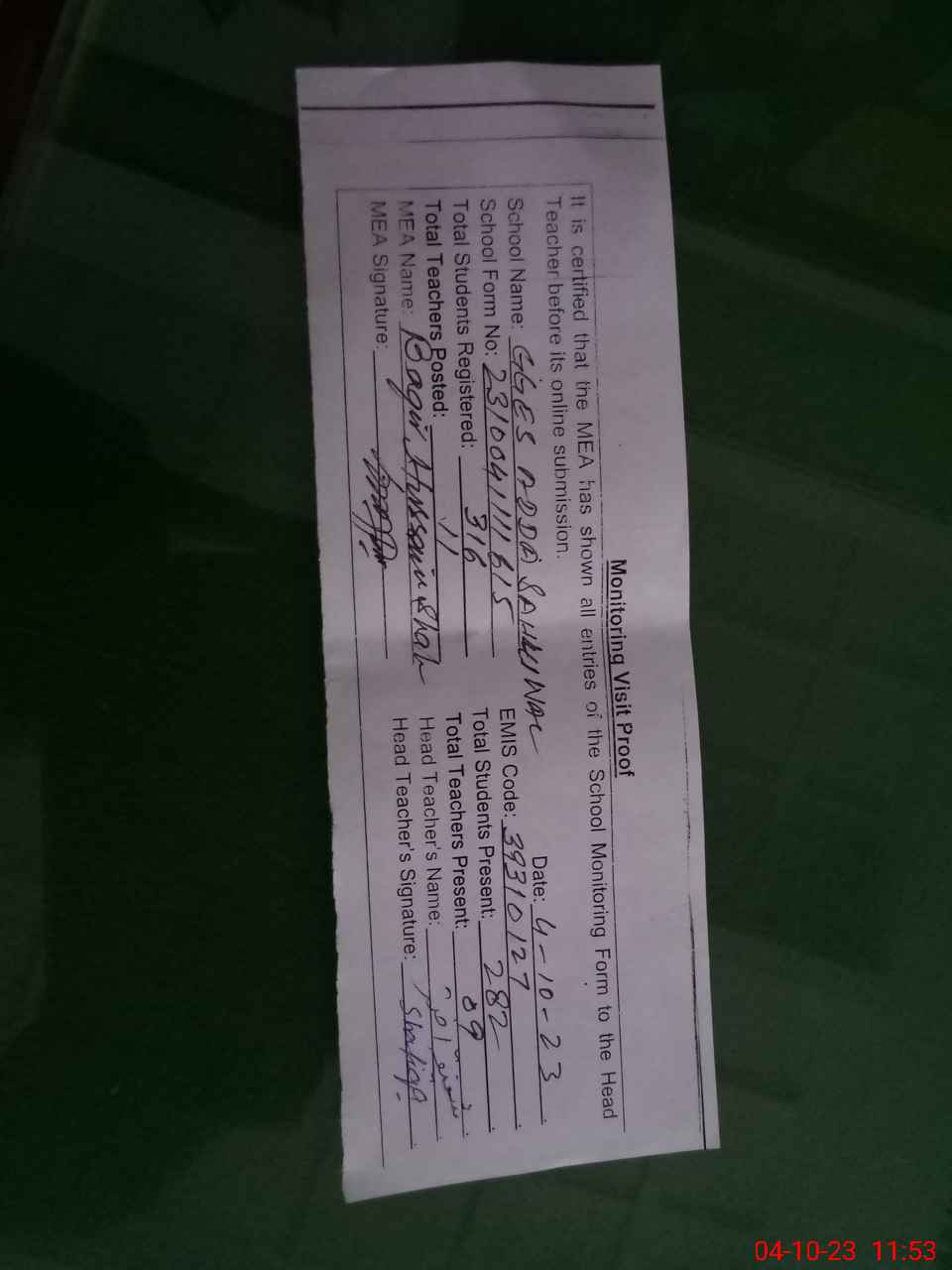 | Certified that this School was Inspected by the Undersigned MEA/DMO Today and the Information Stated Above is as Per Record. | |||||