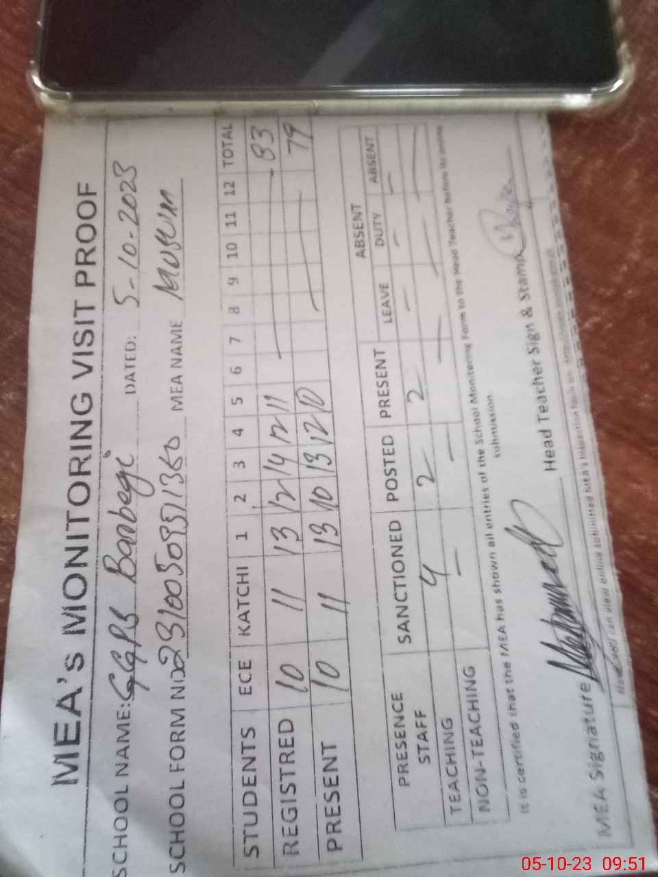 | Attendance Register | Head Teacher | MEA with School | Visit Proof |