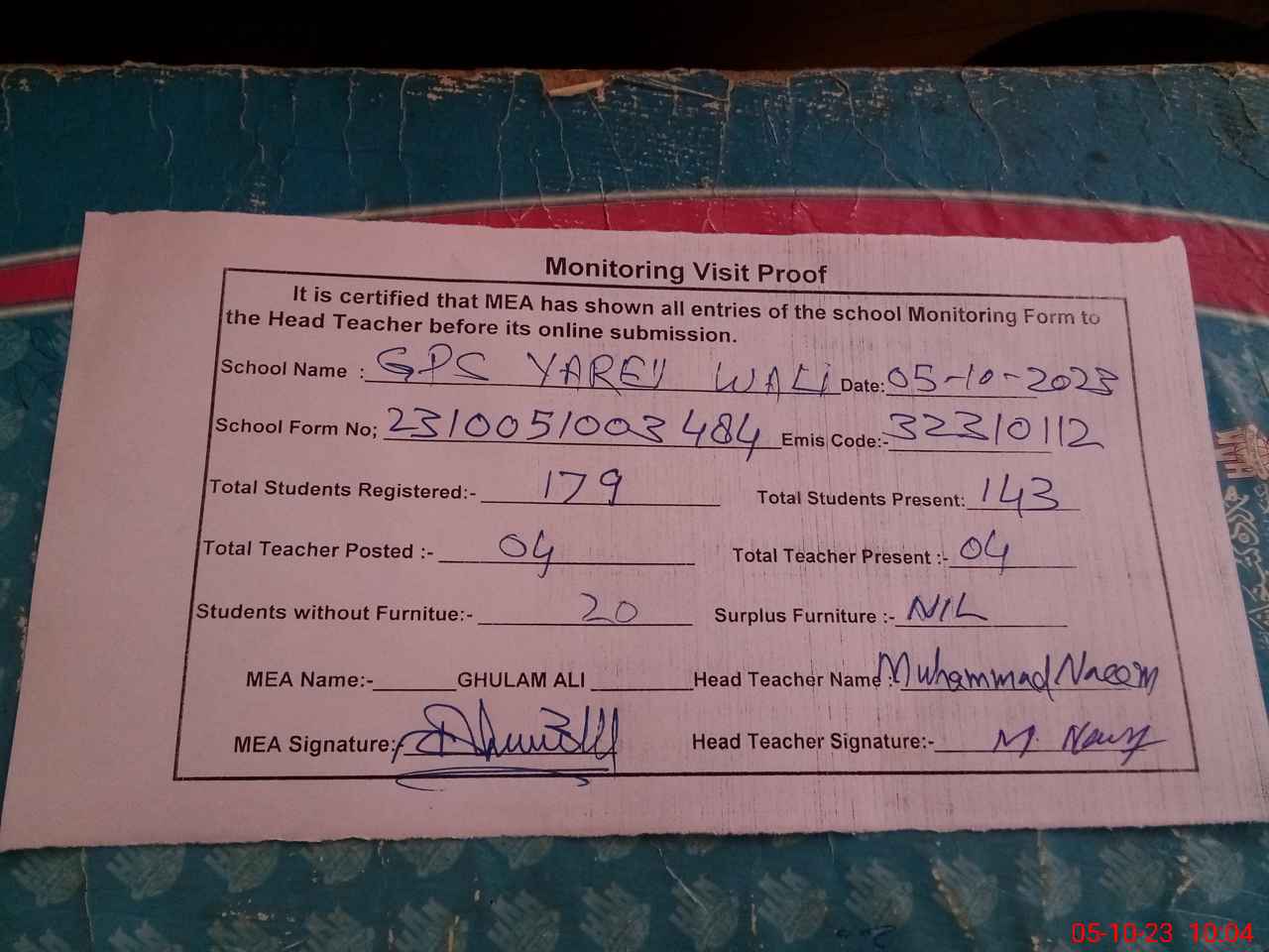 | Attendance Register | Head Teacher | MEA with School | Visit Proof |
