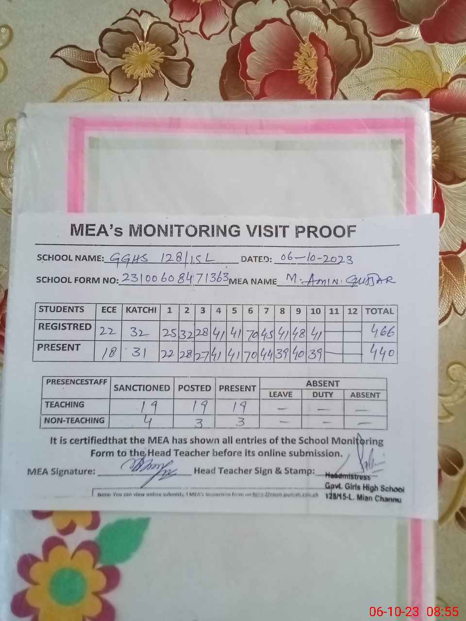 | Certified that this School was Inspected by the Undersigned MEA/DMO Today and the Information Stated Above is as Per Record. | |||||
