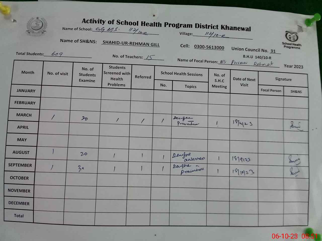 | School Visited by School Health & Nutrition Supervisor (No. of Visits) | 1 | Name1: | Shahid Ur Rehman | Name2: | |