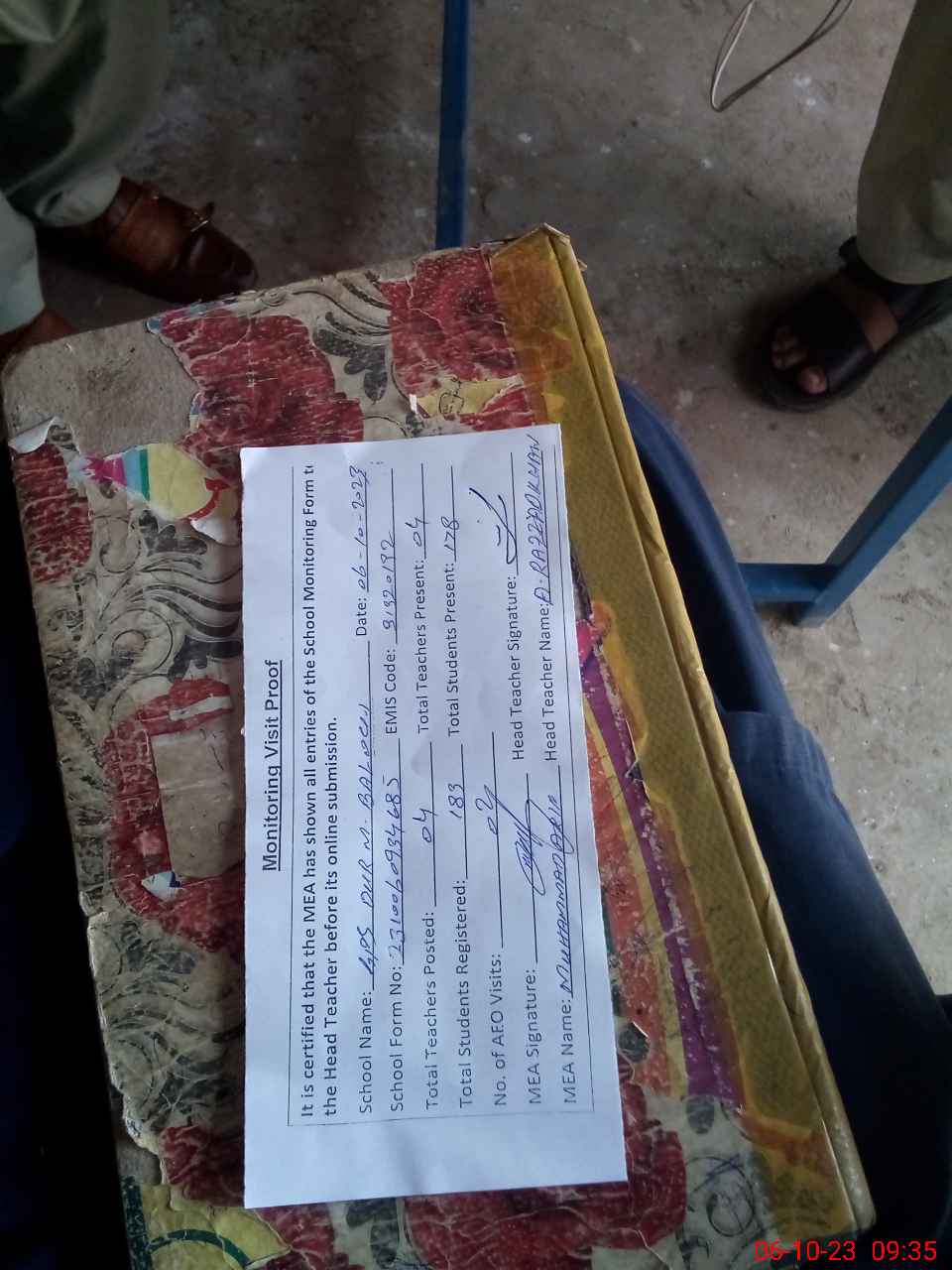 | Attendance Register | Head Teacher | MEA with School | Visit Proof |