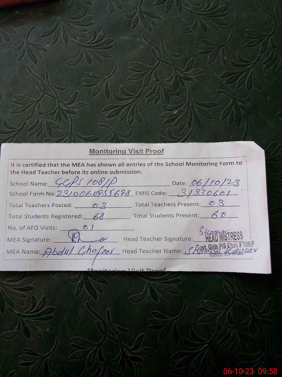 | EMIS Code: 31330601 | Name of School: GGPS CHAK NO. 108/P | |||