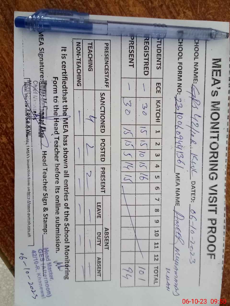 | Attendance Register | Head Teacher | MEA with School | Visit Proof |