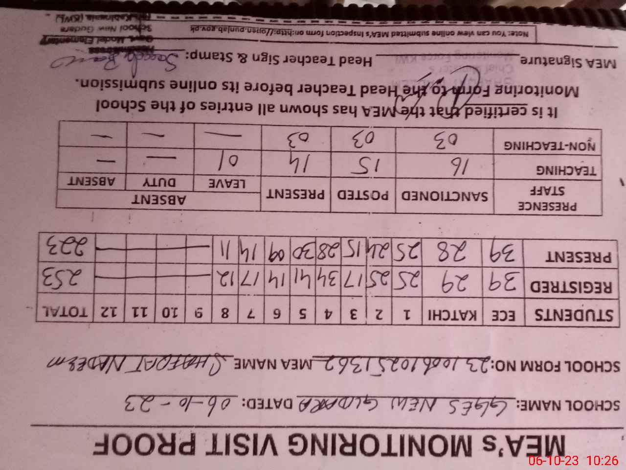 | Attendance Register | Head Teacher | MEA with School | Visit Proof |