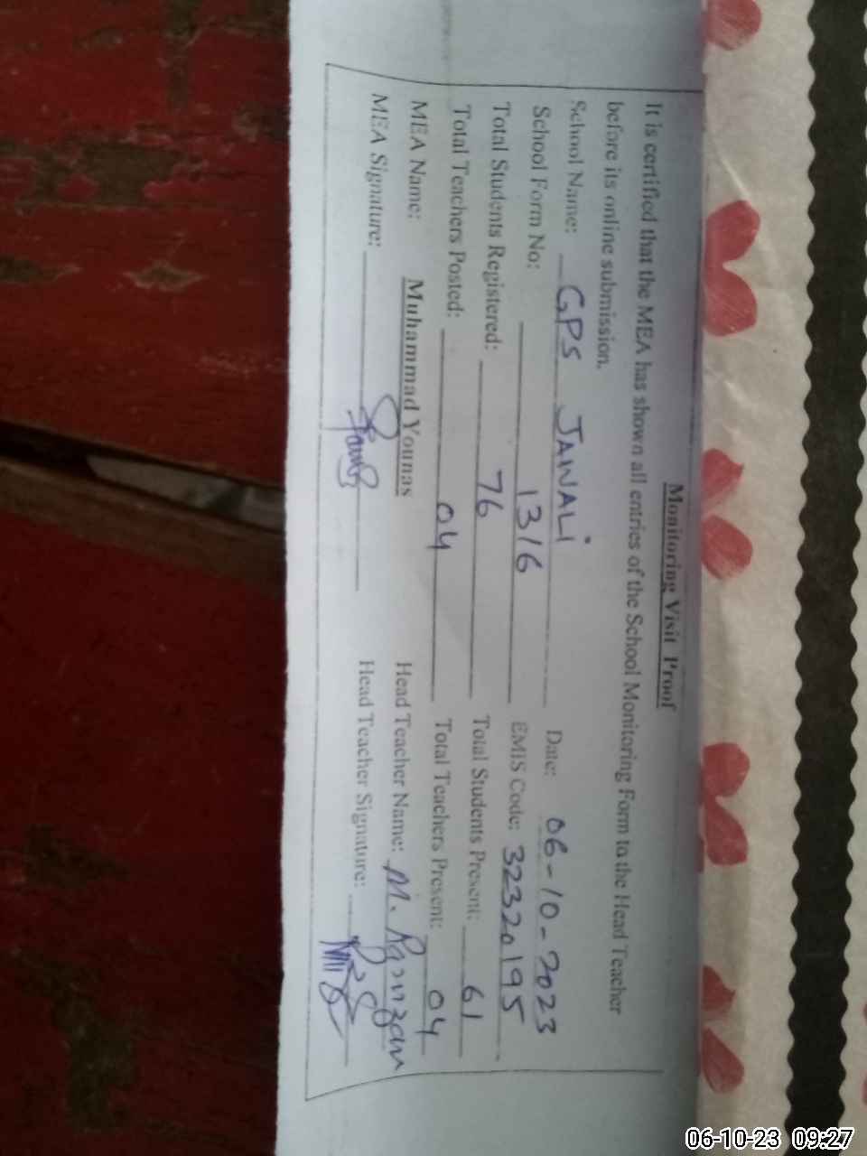 | EMIS Code: 32320195 | Name of School: GPS JAWALI | |||