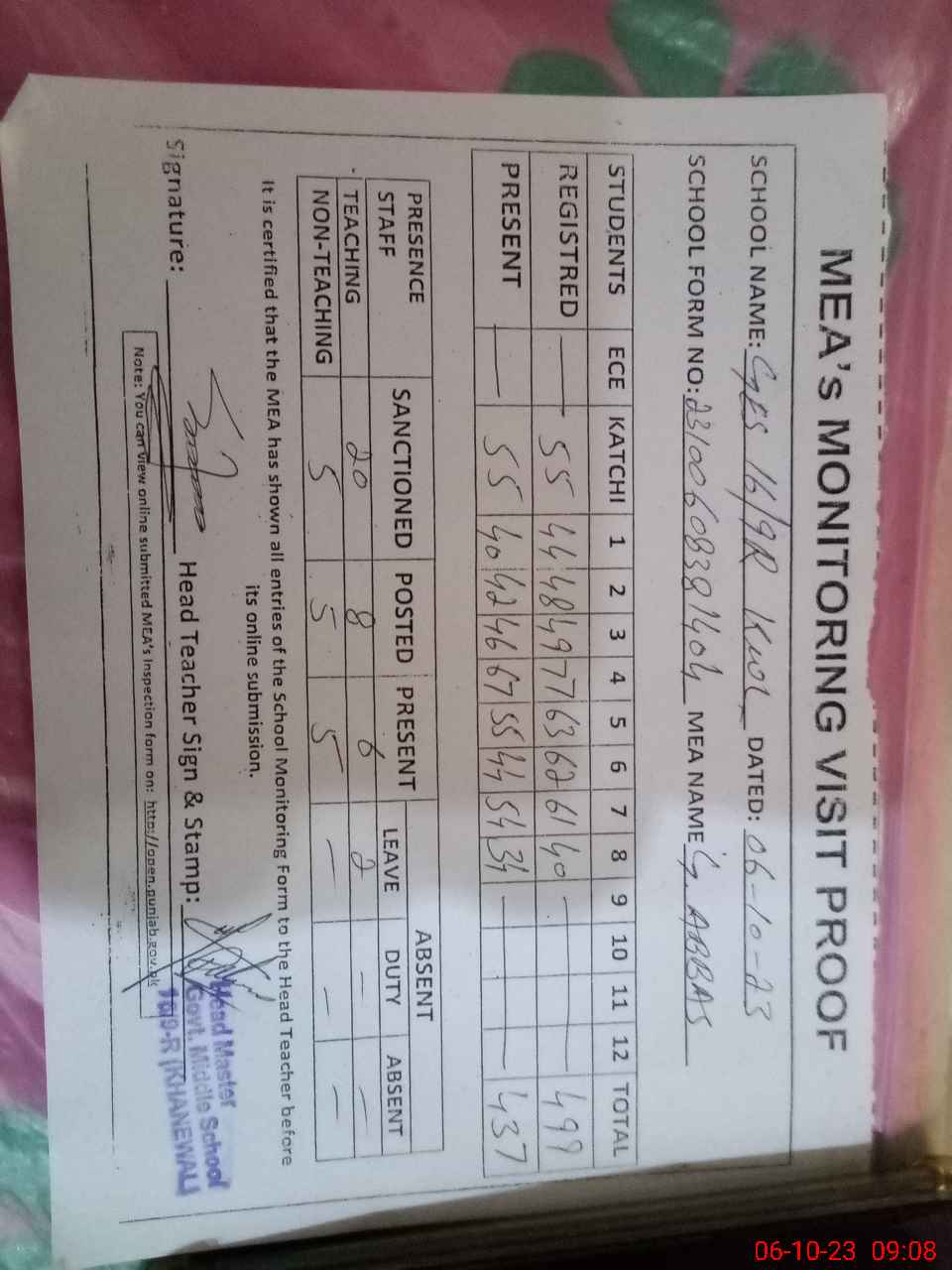 | Attendance Register | Head Teacher | MEA with School | Visit Proof |
